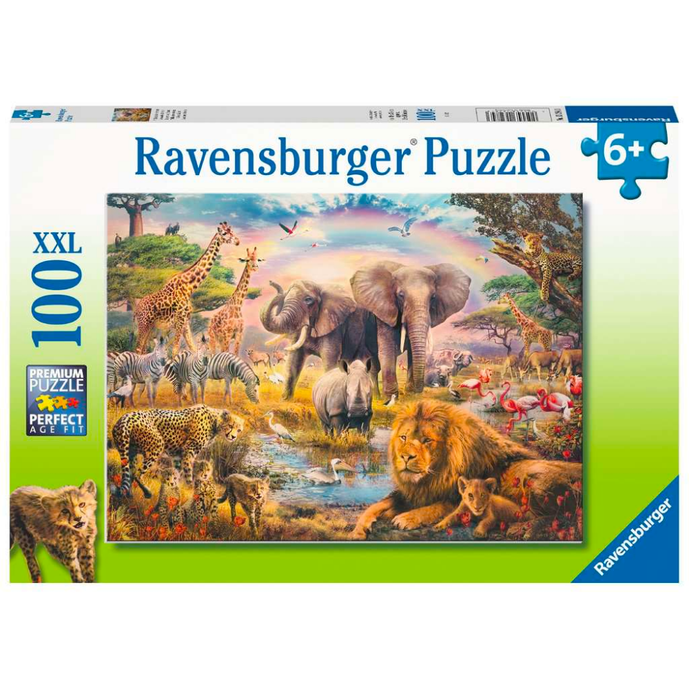 Lion, leopard, rhino, elephant and African buffalo are the famous "big five" that all safari tourists dream of seeing. These species star on this puzzle alongside many other wonderful creatures, including zebra, giraffe, flamingo, cheetah, antelope, vultures, stork and heron. This puzzle is packed with interesting animals, colours and details.