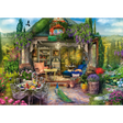 Step into a dreamy oasis with this enchanting 1000-piece puzzle, featuring a whimsical garden shed nestled among rolling vineyards. This breathtaking scene blends the beauty of nature with the charm of a cozy retreat. The open-air shed reveals an elegant interior adorned with vintage furniture, twinkling chandeliers, and a well-stocked wine shelf, inviting you to relax in luxury. Outside, a beautifully set table awaits for a delightful garden feast, surrounded by blooming flowers, lush greenery, and a regal peacock strolling along the cobblestone path.