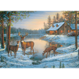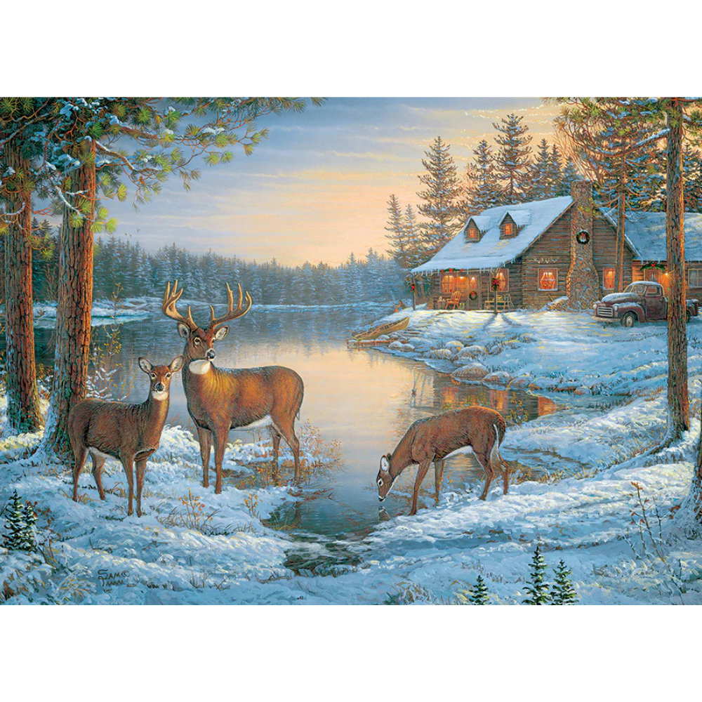 The three deer have found a quiet place to rest for the evening. They'll grab a drink of fresh water from the lake before settling in the snow near Sam Timm's cabin. His home is decorated in Christmas wreaths and icicles, ready to ring in the holidays. His snow covered truck hasn't moved in two days, it's vacation time.
