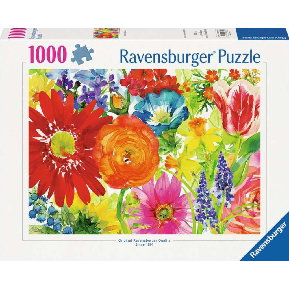 Dive into this watercolour wonder of stunning blooms with Gerbera daisies, ranunculus, variegated tulips and more! Immerse yourself in a world of vibrant colour and natural beauty. This stunning 1000-piece puzzle features an exquisite collection of flowers, bursting with life in every shade of the rainbow.