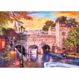 Robert Adam's famous Georgian bridge spans the River Avon, its honey-coloured stone glowing in the sunset tones of early evening. Below, the weir adds drama, and commands respect from the narrowboat owner travelling on towards Bradford-on-Avon. The rich orange and golden tones in the sky are echoed in the warm colours of the red phone box, street lamps and autumn leaves.