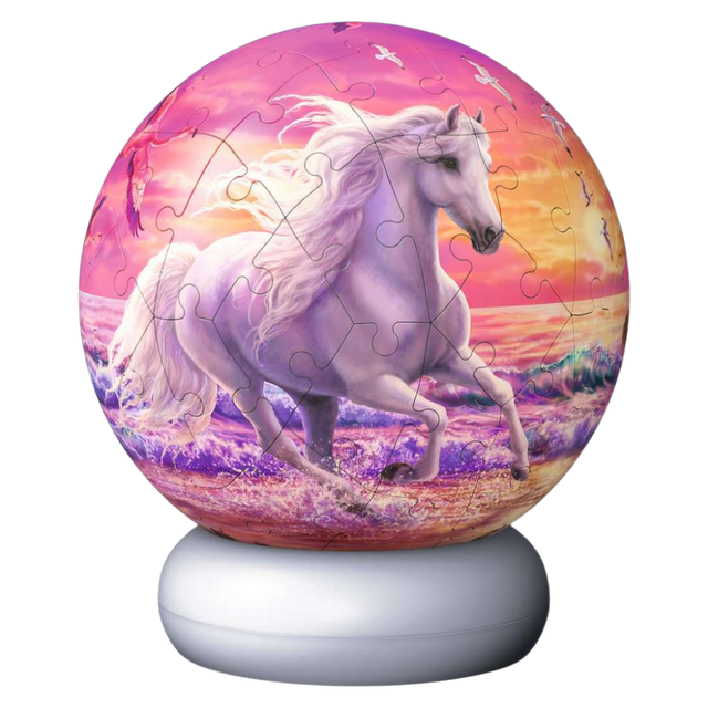 Experience a whole new dimension of puzzle-making with this exciting 3D puzzle. As you assemble the pieces, you will slowly shape the journey the horses are going on. Perfect for both young and old who love a challenge while also enjoying a beautiful decorative object. The 3D Puzzle-Ball becomes a cool night light as soon as the light base illuminates the ball from within.