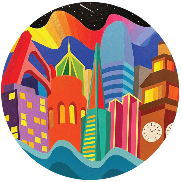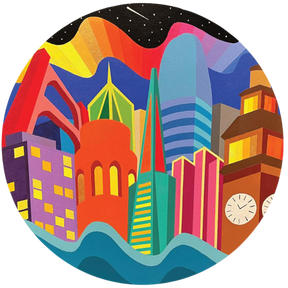 As stylish and vibrant as San Francisco itself, Jordan Herren's pop art celebrates the City by the Bay in painted panoramas like none other. Herren, a local born-and-raised, captures the aesthetic drama of a cultural hub jam-packed with iconic architecture. Accented with natural and cosmic details, the City Vibes skyline sizzles with color and energy.