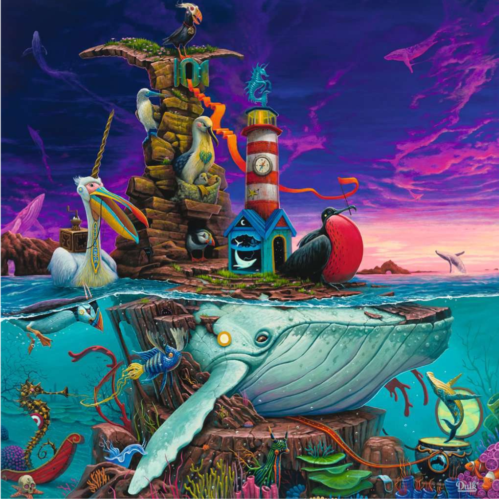 An incredibly rare albino humpback whale is being transformed into part of the archipelago, creating a place of refuge for all the birds and marine species. The souls of lost animals fly in the sky.