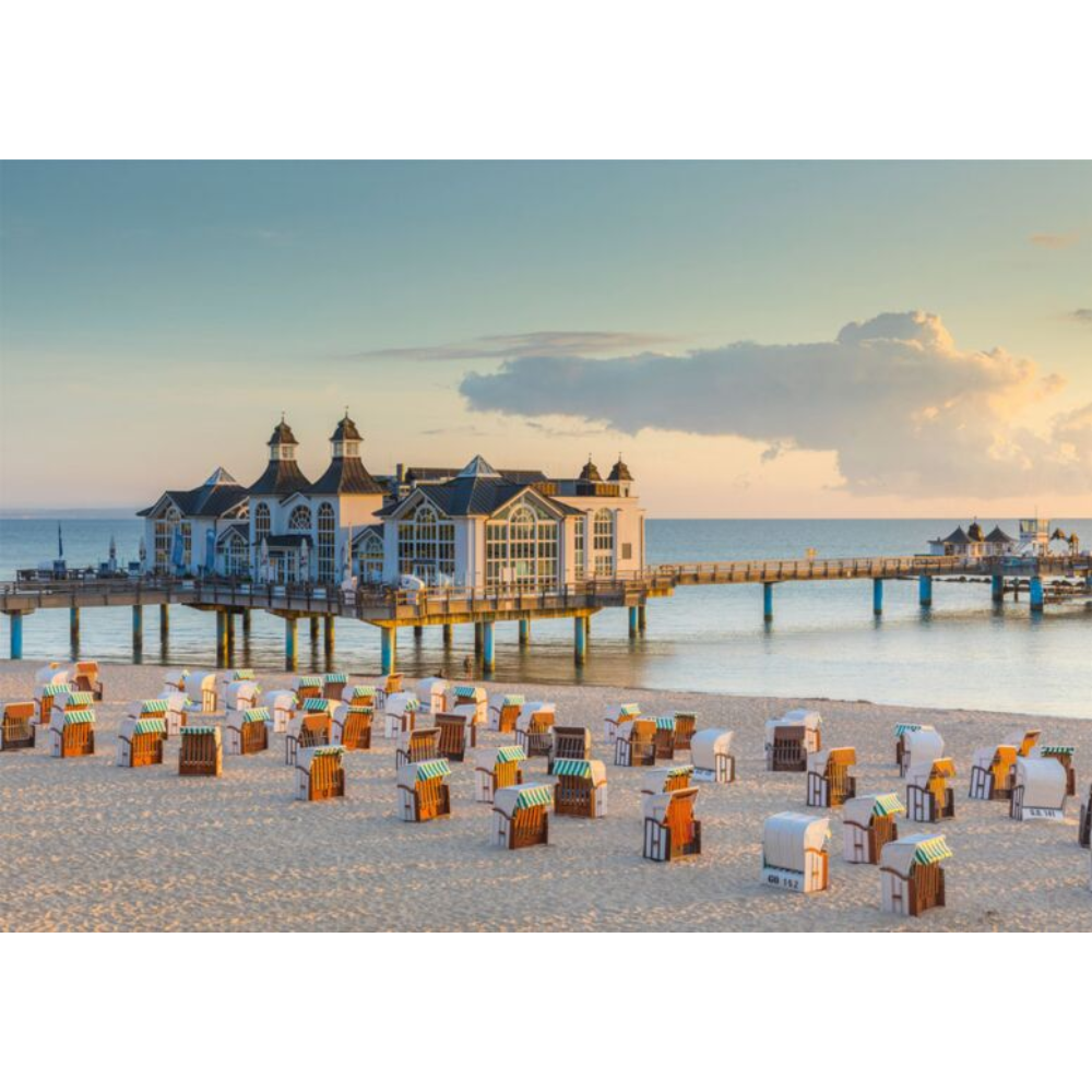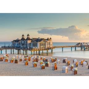 Immerse yourself in the tranquil beauty of the Baltic Sea with this stunning 500-piece jigsaw puzzle featuring the iconic Sellin Pier on Rügen Island, Germany. The puzzle captures a serene coastal scene with the elegant pier building extending into calm waters, surrounded by a sandy beach adorned with traditional wicker beach chairs (“Strandkörbe”).