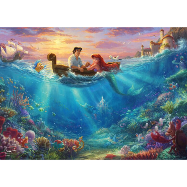 As the evening sun retreats beyond the horizon, a new love is forming somewhere between two beautiful worlds. The artists at Thomas Kinkade Studios have brilliantly captured one of Disney’s most popular and adored films in in one scene entitled, Disney The Little Mermaid Falling in Love.