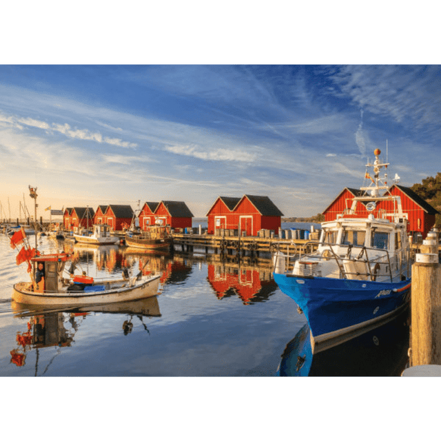 This 500 piece jigsaw showcases a beautiful photographic image of a quiet fishing harbour in the quaint Weisse Wiek region in Germany.