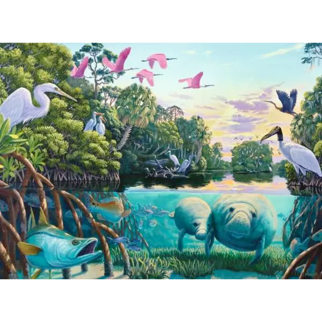 This soothing scene depicts a momma manatee and her baby enjoying clear waters in the Everglades, while a Great Egret, Wood Stork and Great Blue Heron find abundant food nearby and colourful flamingoes fly overhead.