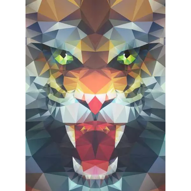 This complex patterns created by this polygon design capture the power of a roaring lion. The muted tones focus our attention on the lion's eyes, mouth and razor-sharp teeth, bringing this 2D image to life. The design combines the contrasting styles of Japanese origami and 1990s video games.