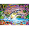 This tropical marine scene features jovial dolphins in flight of a jump surrounded by colourful vegetation and birds flying around also with an under water peak of all the life happening under the sea. Created by artist Carolyn Steele. Features extra large pieces.