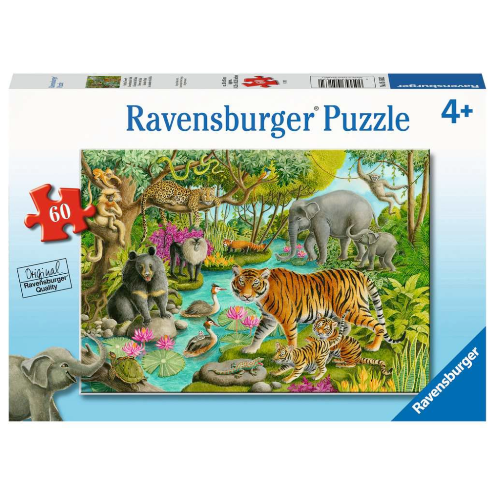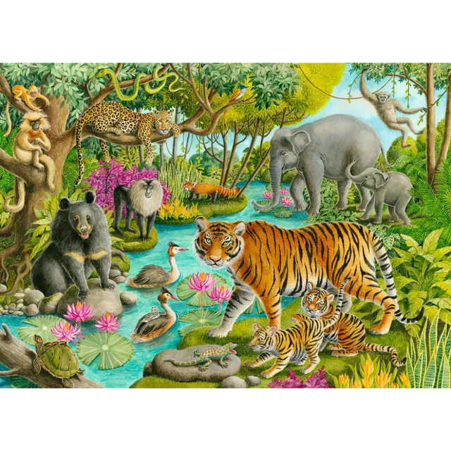 Hang out with the exotic creatures inhabiting our "Animals of India" puzzle! The trees in this Indian forest are teeming with wildlife like golden langur monkeys, a leopard and a Lar gibbon! An Asiatic black bear, lion-tailed macaque, red panda and Asian elephants stay close to the fresh water, where a pair of Great Crested Grebe birds swim; can you spot their youngster? The Bengal tiger cub isn’t sure about that spotted green gecko!