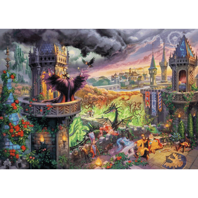 This artwork was painted in the narrative panorama style, sharing many characters and moments from the Disney film Sleeping Beauty in one stunning painting. It captures Maleficent in both of her personas – as an evil fairy and when she shapeshifted into a dragon in the Forbidden Mountain.