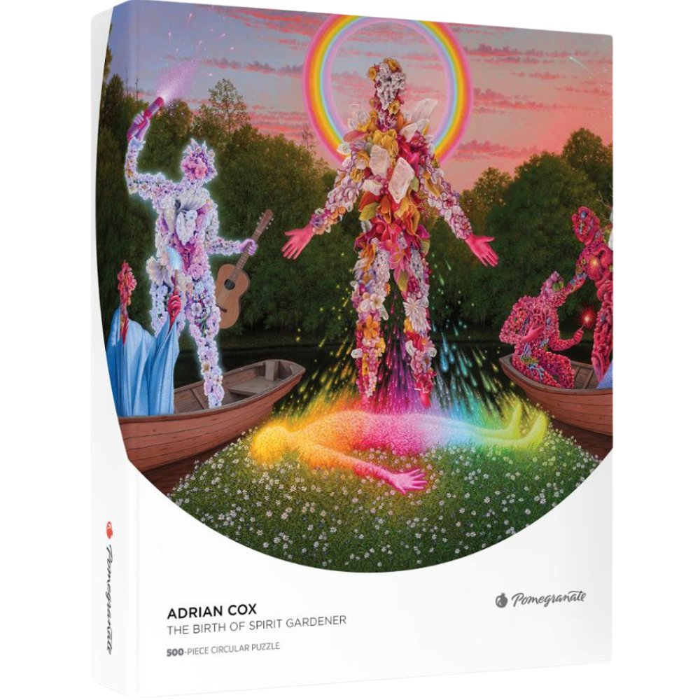 Adrian Cox welcomes viewers to "the threshold of the real and the imagined, the physical world and the world of dreams." The artist refers to the inhabitants of his work from the series Into the Spirit Garden as Border Creatures, "a group of hybrid beings that live in the verdant wilderness of the Borderlands." In this image, the Spirit Gardener - depicted in rainbows on the central island - experiences a death and rebirth while their companions celebrate their transition. Cox's mythology employs the nonhuman to represent the journey of existence. This piece was originally commissioned by the band Tool, to be used as a tour date poster, and eventually became a centerpiece of Cox's allegorical series.