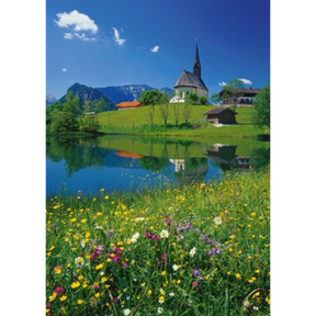 Escape to the tranquil Bavarian countryside with this captivating 1000-piece jigsaw puzzle from Schmidt. The image features the idyllic village of Inzell, highlighting the picturesque St. Nicholas Church and the surrounding Einsiedlhof area. A vibrant meadow filled with wildflowers leads to a calm lake, reflecting the church and the surrounding alpine landscape.