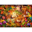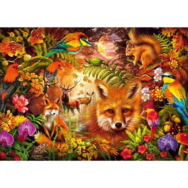 Immerse yourself in a dazzling celebration of nature with this vibrant 1000-piece puzzle. This breathtaking scene captures the heart of the wild, where a majestic fox gazes intently, surrounded by a lush tapestry of flora and fauna. Brilliantly coloured birds flutter among the blossoms, a playful squirrel perches above, and a serene stag stands in the golden glow of the enchanted forest.
