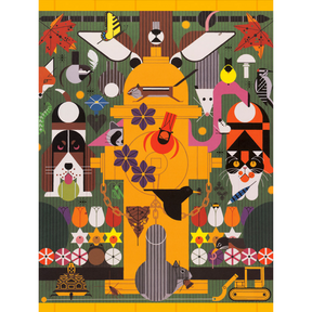 Charley Harper loved animals, and both wild and domestic varieties can show up in suburbs, the subject of this delightful painting. You might not see the snake or the frog at first glance, or the raccoon peeking at you. But put this 300-piece puzzle together, and all will be revealed.