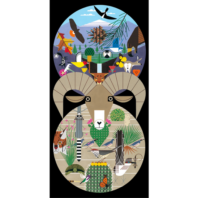 California quail trot across a cacti-laden desert, while a cougar peeks out between the horns of a bighorn sheep. A hawk soars above while a rattlesnake slithers out of the scene, below. Spend some time in the desert with Harper’s clever composition, reproduced here in 1,000-pieces.
