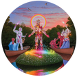 Adrian Cox welcomes viewers to "the threshold of the real and the imagined, the physical world and the world of dreams." The artist refers to the inhabitants of his work from the series Into the Spirit Garden as Border Creatures, "a group of hybrid beings that live in the verdant wilderness of the Borderlands." In this image, the Spirit Gardener - depicted in rainbows on the central island - experiences a death and rebirth while their companions celebrate their transition. Cox's mythology employs the nonhuman to represent the journey of existence. This piece was originally commissioned by the band Tool, to be used as a tour date poster, and eventually became a centerpiece of Cox's allegorical series.