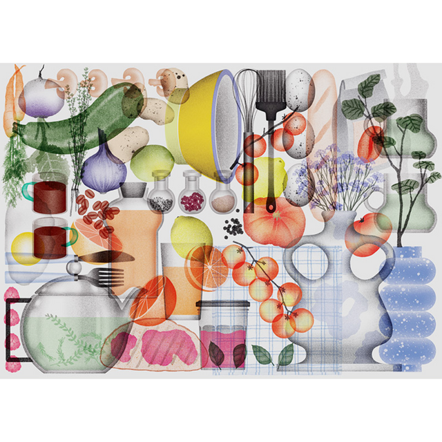 Meet kitchen, the third course in Cloudberries' exclusive small batch series. Artwork by french artist Sarah Mafféïs is served hot, featuring classic kitchen ingredients and utensils in a stylish, x-ray inspired style.