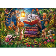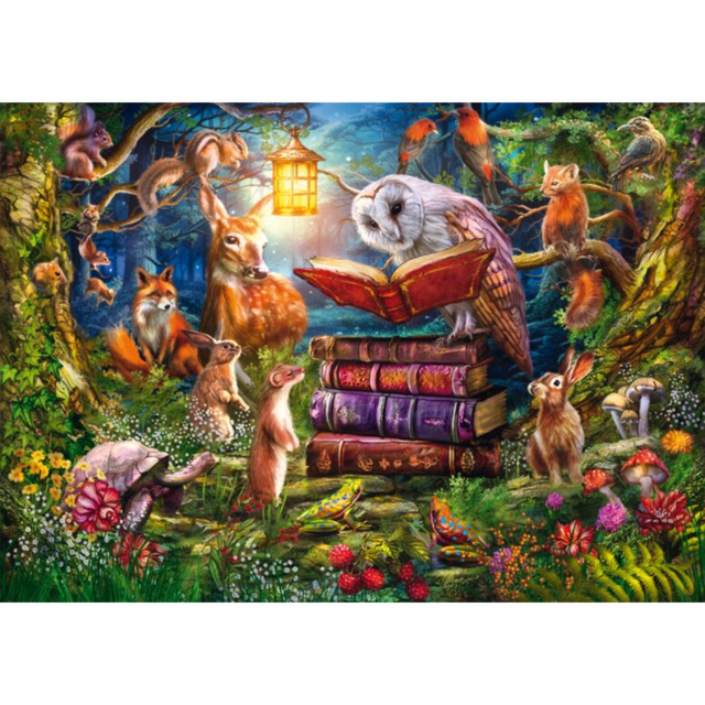 Step into a magical woodland gathering with the Forest Stories at Night Puzzle. This enchanting 1000-piece puzzle features a captivating nighttime scene where forest animals, including an owl, deer, foxes, squirrels, rabbits, and more, come together under the soft glow of a lantern. At the heart of the scene, the wise owl reads a story from atop a stack of beautifully detailed books, surrounded by lush greenery, vibrant flowers, and whimsical mushrooms.