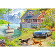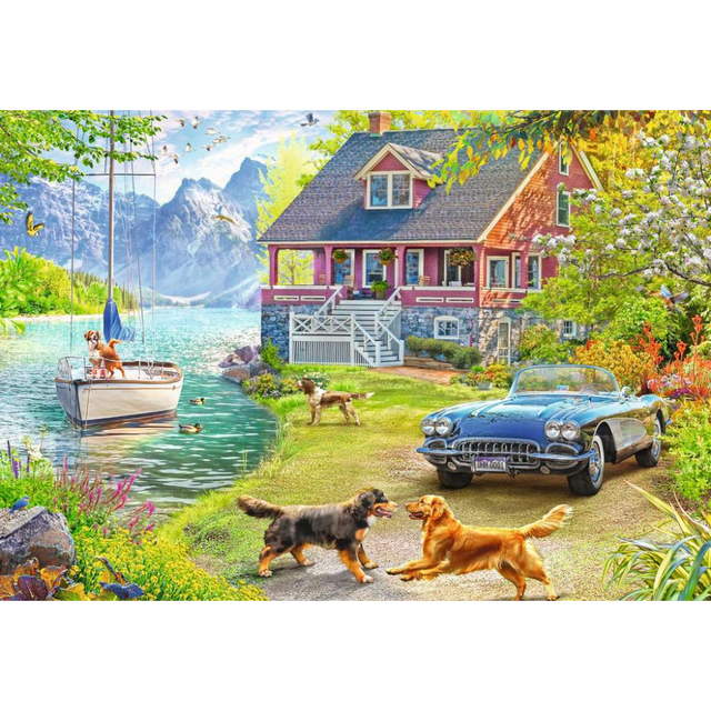 Escape to a serene retreat with this 200-piece extra-large jigsaw puzzle, featuring a picturesque summer lake house surrounded by nature’s beauty. Dogs joyfully play along the shore, while ducks sit peacefully on the sparkling lake. An old classic car is parked nearby, adding a touch of nostalgia to the tranquil setting.
