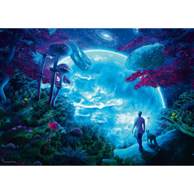 Step into a cosmic dreamscape with the Heaven Fantasy Puzzle. Featuring the surreal artistry of Cameron Gray, this 1000-piece puzzle brings a fantastical scene to life. A glowing celestial planet dominates the background, framed by vibrant red foliage, towering mushrooms, and lush alien flora. A lone figure and their canine companion stand at the edge of this ethereal world, gazing into the cosmic wonders that include galaxies and floating rocks.