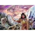 This stunning image captures the essence of mystique and wonder, as the young woman, a guardian of dreams, sits surrounded by wolves, holds a delicate dreamcatcher in her hand—a symbol of hope, protection, and the power to weave dreams into reality.