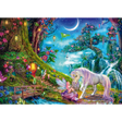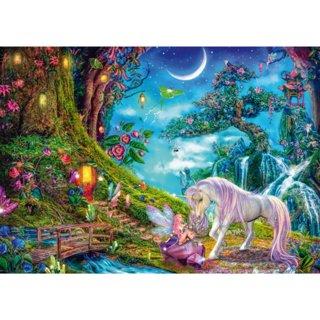 Explore through the forest to find this scenic view of a unicorn and fairy in a moonlit glade.