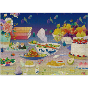 This modern art puzzle is full of tempting treats including an overflowing fruit bowl, a trio of delicious cakes and dishes of fresh salad.