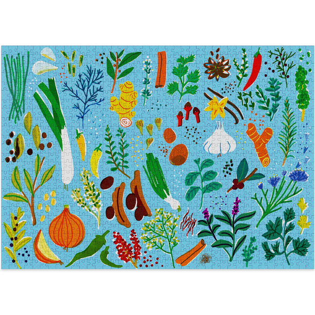 This tasty food puzzle will add plenty of zest and flavour to your puzzling life, with its beautiful illustrations of herbs, vegetables and spices against a cool blue background.