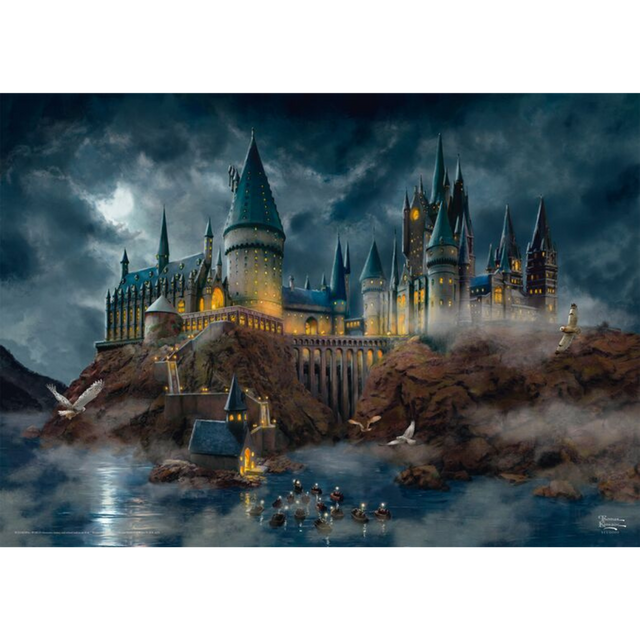 Step into the magical world of Harry Potter with this stunning 1000-piece puzzle featuring Hogwarts Castle, beautifully illustrated by Thomas Kinkade Studios. Bathed in moonlight and mystery, this atmospheric scene captures the majesty of the castle rising above the lake, glowing with warm lights and magical allure.