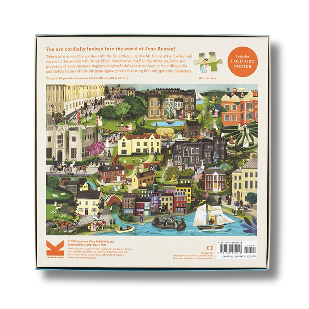 Featuring a wide cast of Jane Austen's contemporaries and characters, take a tour of Austen's world from the rolling hills of Derbyshire, via Hampshire and Lyme Regis, to the golden stone of the Bath skyline as your build this puzzle.