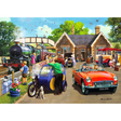 There's a promise of happy times ahead with this scene. Passengers board the waiting train; are they travelling to the next town, the city or even to the coast? In the car park a family is about to continue their journey by bus, a Grandma collects her grand-daughter, and a young couple look forward to spending the day together.