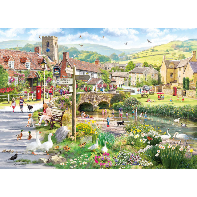 Welcome to a delightful day in the village! Ducks (and children!) paddle happily in the stream, while the villagers enjoy a leisurely day of rural life, soaking up the peaceful surroundings. Make sure to top at the local pub, which is perfect for a friendly chat or a refreshing drink. It’s easy to imagine yourself right there, basking in the warm afternoon sun.