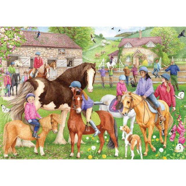 Experience the serene charm of the countryside with Falcon de luxe - Riding School, a beautifully illustrated 1000-piece puzzle. This picturesque scene, created by Anne Searle, captures the essence of a peaceful day at the riding school, where equestrians of all ages come together.