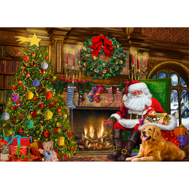 Santa is enjoying a break by the log fire with his loyal Golden Retriever beside him. The beautifully decorated Christmas tree is laden with presents and stockings are hanging over the fire. This festive puzzle will certainly get you into the festive mood.