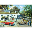 A picturesque 1000-piece jigsaw puzzle featuring the idyllic Dales landscape, one can envision a charming scene set around a cozy public house. The puzzle showcases the beauty of the countryside with two horses and their riders walking along nearby. An old blue bus adds a touch of nostalgia to the setting, parked nearby is a vibrant red soft-top car, waiting for the farmer to pass by with his herd of sheep. A sheepdog diligently keeping an eye on the herd.