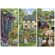 The central panel portrays a charming stone farmhouse adorned with colourful blooms, a testament to quaint country living. It's a snapshot of idyllic daily life where dogs await their owners and butterflies dance in the garden.