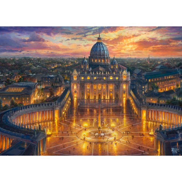 The beauty of the Vatican City has to be seen to be believed! This stunning image from Thomas Kinkade depicts the Vatican under the evening sky, and will make you want to visit St Peters Basillica and the surrounding city Rome.