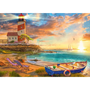 Lars Stewart brings us this delightful coastal scene, the lighthouse soaks up the sunset in this soothing and warm scene. This is a new release for 2024 from Schmidt.