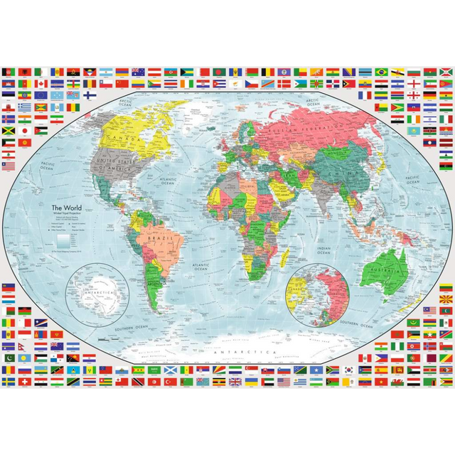 The Future Mapping Company has created this map especially for Ravensburger, using the Winkel Tripel projection alongside bolder, clearer text. First seen in print in 1955 as The Times Atlas of the World, the projection was designed by Oswald Winkel in 1921 with the aim of minimizing the three areas of distortion faced by map makers: area, direction and distance. Thus it became the Tripel Projection (Tripel is German for triple). The result is a wonderfully spherical-looking map, which gives a graceful curve to oceans and landmasses alike.