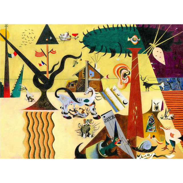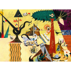 Suffused with sunlight, The Tilled Field is one of Modern master Joan Miró’s groundbreaking Surrealist works. Amidst a perhaps perplexing chaos, Miró’s visionary order juxtaposes the natural and human-made worlds while expressing the artist’s belief that every natural object has a soul. In a flat perspective rooted in Cubism’s shallow planes, a stylised farmer tills the land, a fantastical tree has both eye and ear, and political references flutter free. The playful painting—conceptualising his family’s farm with iconography from Spanish tapestries, Catalan ceramics, early Christian art, and even earlier cave paintings—is, at heart, Miró’s love letter to his Catalonian homeland.