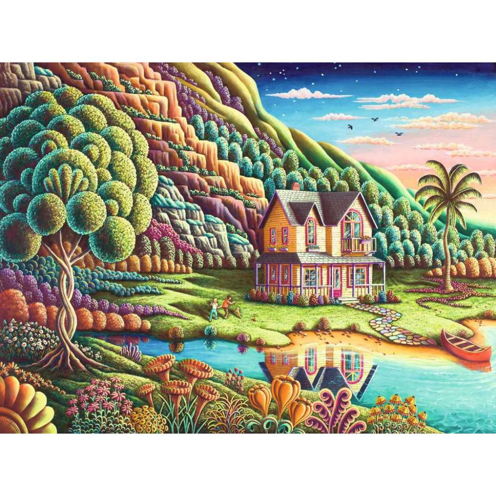 The charming Victorian house sits perfectly reflected in the tranquil waters below, complete with its cheerful yellow and purple façade and welcoming front porch. I love how the scene balances the fantastical with the familiar - those surreal, almost quilted hills in the background contrast beautifully with the realistic touches like the little rowing boat and stepping stones.