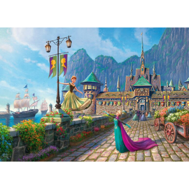 Step into the magical kingdom of Arendelle with this stunning 1000-piece puzzle, featuring the beloved sisters Elsa and Anna from Disney’s Frozen. This beautifully detailed illustration captures the joy and wonder of Arendelle, as Anna twirls with excitement on a stone bridge, while Elsa gracefully welcomes her with an enchanting gesture. The scene is brought to life with vibrant flowers, majestic mountain landscapes, and grand medieval architecture, with ships sailing into the harbour, adding to the fairy-tale charm.