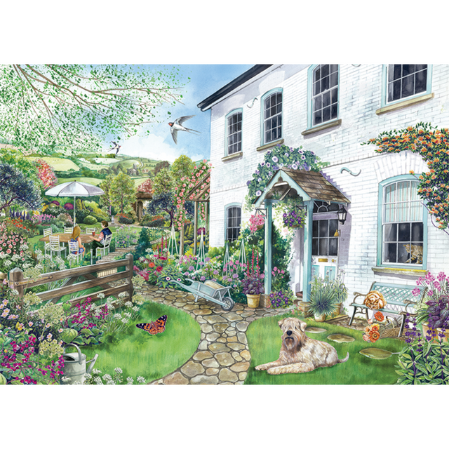 The colourful image depicts an idyllic country cottage and its lush garden in full bloom. The sun is shining as the resident cat and dog relax on the lawn, while their owners enjoy a quiet drink at the table nestled at the end of a winding path through pretty beds of wild flowers.
