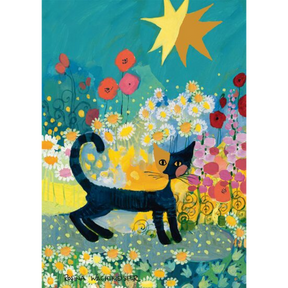 Cat in a Sea of Blossom is a vibrant 1000-piece jigsaw puzzle featuring the joyful, expressive artwork of Rosina Wachtmeister. A graceful black cat moves through a meadow bursting with colourful flowers, beneath a bright sun and a sky filled with playful shapes and textures. The scene radiates warmth, movement, and optimism, brought to life through bold colours and decorative patterns.