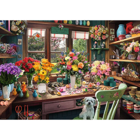 This beautifully illustrated puzzle invites you into a tranquil world of floral creativity, where a rustic desk overflows with freshly arranged blooms, vases, and florist’s tools, all ready for the next creation. Above, shelves are lined with colourful baskets of flowers, filling the cosy shed with vibrant life and charm. Adding a heartwarming touch, a faithful dog rests on the chair, quietly keeping the flower arranger company.