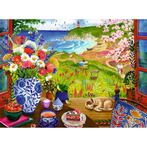 Featuring a beautiful coastal seaside scene, this puzzle invites you to enjoy a tranquil window view of the ocean, complete with a classic lighthouse, walkers on the shoreline, and a peaceful sleeping dog indoors. A colourful vase of flowers adds a cosy, homely touch, making this puzzle perfect for those who love coastal artwork and scenic seaside puzzles.