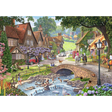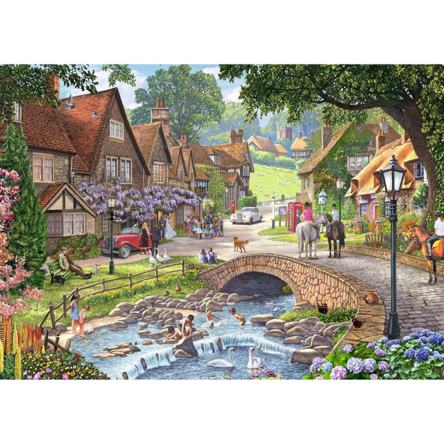 This 1000-piece Ravensburger jigsaw puzzle depicts a charming countryside village scene, with cottages lining a gentle stream, a stone bridge at its centre, and villagers enjoying a peaceful day outdoors. From grazing horses and colourful gardens to children paddling in the water, the artwork is full of warmth, detail, and classic rural charm.