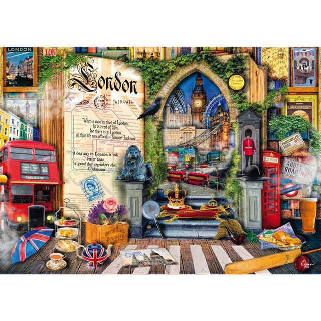 Take a trip through the heart of London with this richly detailed collage by Aimee Stewart. From red buses and black cabs to Big Ben, Abbey Road, and afternoon tea, this puzzle celebrates all the charm and bustle of England’s capital.